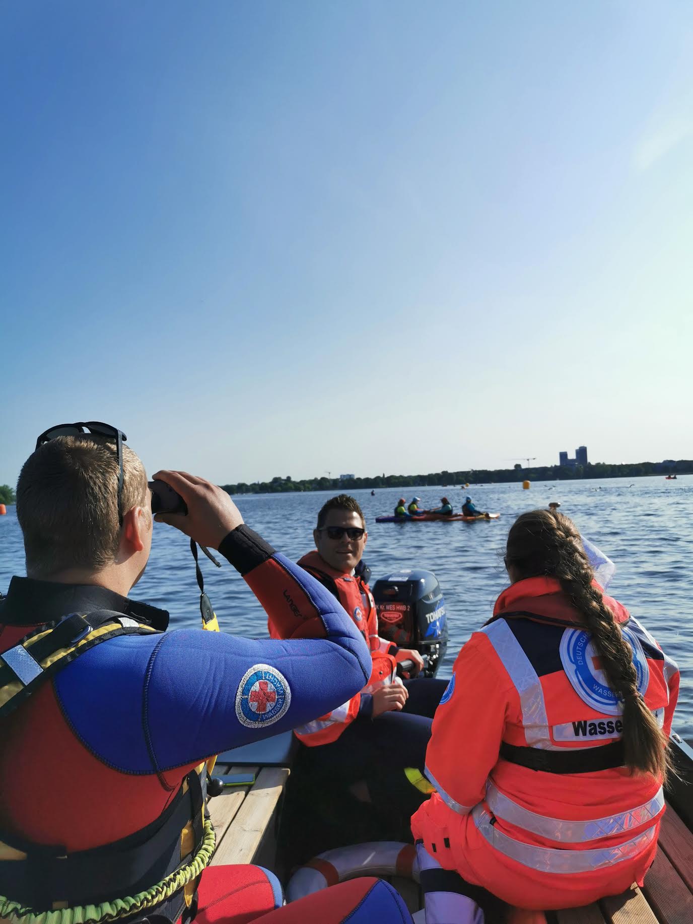 Bereits um 4 Uhr am nächsten Morgen standen die Aktiven wieder auf dem Boot bereit, um pünktlich den ersten Start um 6 Uhr gemeinsam mit anderen Einheiten der DRK Wasserwacht abzusichern. Mehrmals mussten die Retter bei den knapp 3.000 Teilnehmenden eingreifen, um auf der Schwimmstrecke schlimmeres zu verhindern.