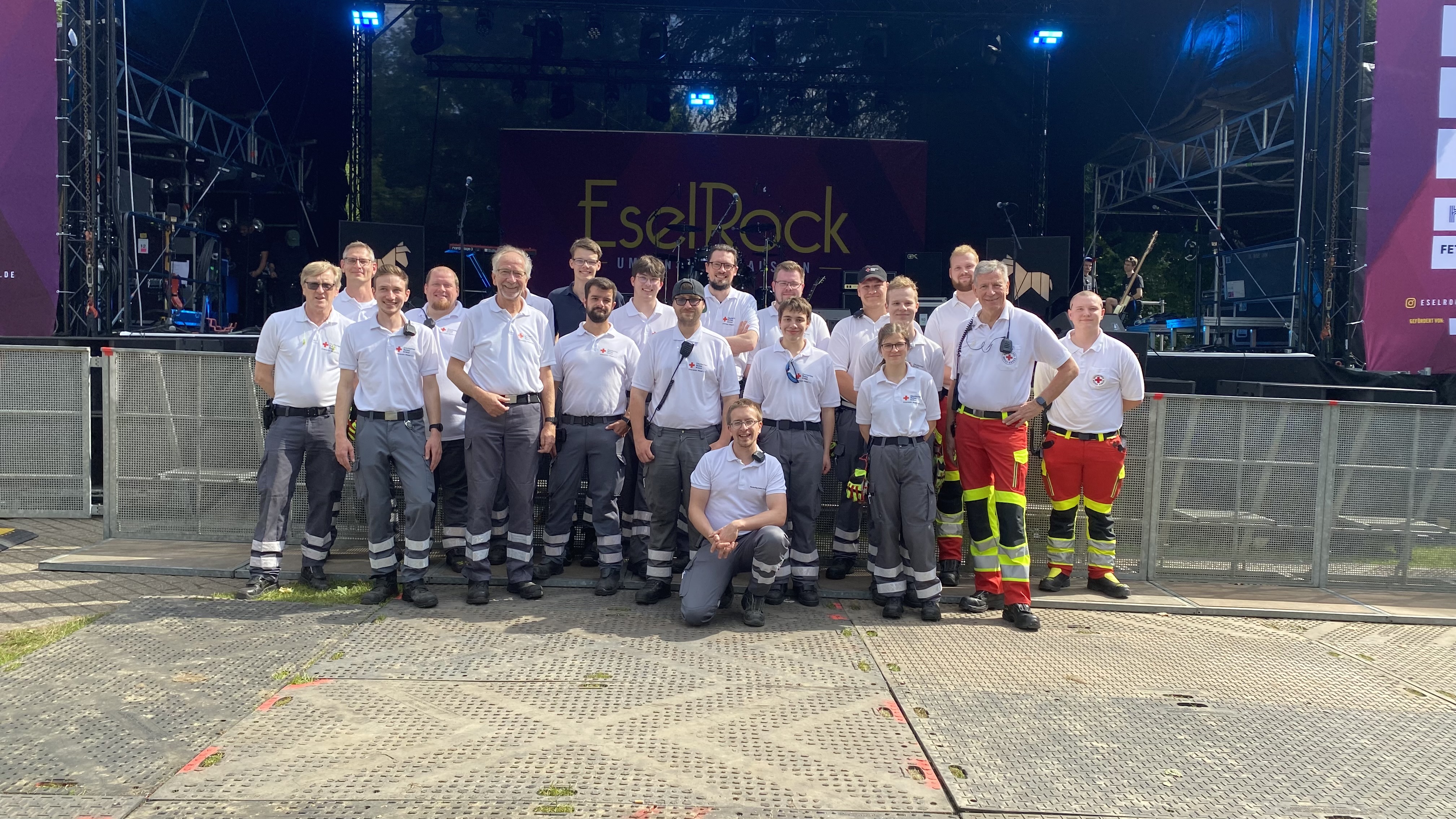 Seit 2008 wird EselRock vollständig von Ehrenamtlichen getragen: Mehr als 80 junge Festivalmacher des Vereins EselRock e. V. bauten Bühnen, Zäune und Infrastruktur auf, während die Rotkreuz-Teams für die medizinische Sicherheit sorgten. Neben der sanitätsdienstlichen Absicherung brachte das DRK erneut sein Spülmobil in den Park – und zeigte damit, dass Ehrenamt, Umweltschutz und schonender Ressourceneinsatz Hand in Hand gehen: Sämtliche Mehrwegbecher und -geschirre aus dem Backstagebereich wurden direkt vor Ort ressourcenschonend gespült, ein klarer Beitrag zur Abfallvermeidung und nachhaltigen Festivalorganisation. Auf den Bühnen lieferten Emil Bulls, Blackout Problems, Paula Carolina, Flash Forward und elf weitere Acts einen Genre-Mix von Indie-Rock bis Funk, ohne Überschneidungen dank Wechselspiel der Bühnen. Hinter den Kulissen koordinierte eine ehrenamtliche Einsatzleitung alle Kräfte via Digitalfunk und Lagekarte, sodass Rettungsmittel auf kürzestem Weg ins Gelände geführt werden konnten.