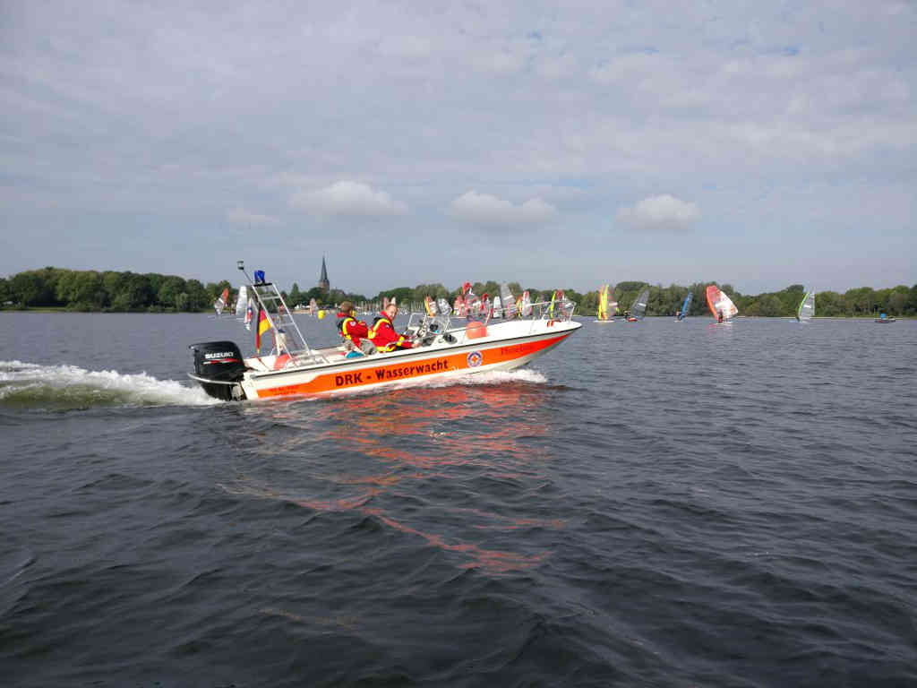 Dabei hatten die Surfer mit der gesamten Bandbreite des niederrheinischen Wetters zu kämpfen. Es wechselte in regelmäßigen Abständen zwischen strahlender Sonne, starken Regenfällen, windigen Böen und absoluter Windstille. Während allen Situationen hatten die Retter der DRK-Wasserwacht Rheinberg stets mehrere wachsame Augen auf die Surfer gerichtet.