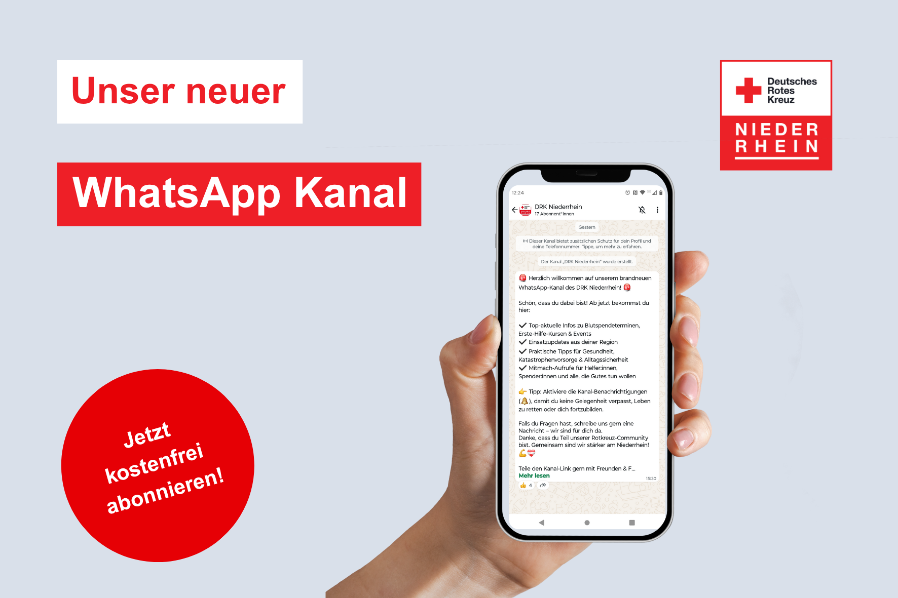 Neues vom Roten Kreuz jetzt per WhatsApp! Der DRK Kreisverband Niederrhein bündelt seine ganze Hilfe-Power – von ambulanter Pflege über Essen-auf-Rädern bis Familienbildung – in einem einzigen Kanal. Einfach www.drk-niederrhein.de/whatsapp öffnen, „DRK Niederrhein“ abonnieren und ab sofort Tipps, Termine & Mitmach-Aufrufe direkt aufs Handy bekommen Weiterlesen