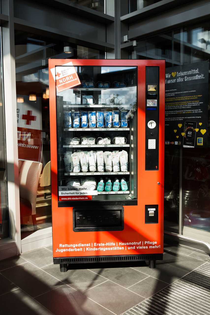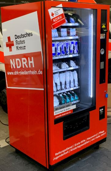 Groß ist die Nachfrage Vieler nach Mund-/Nasen-Masken und Desinfektionsmitteln. Dieser Nachfrage will der DRK-Kreisverband Niederrhein mit einer Eigen-Entwicklung begegnen: einem Automaten, aus dem man beides ziehen kann. Sein Name ist "DRK-SCHUTZ-AUTOMAT".